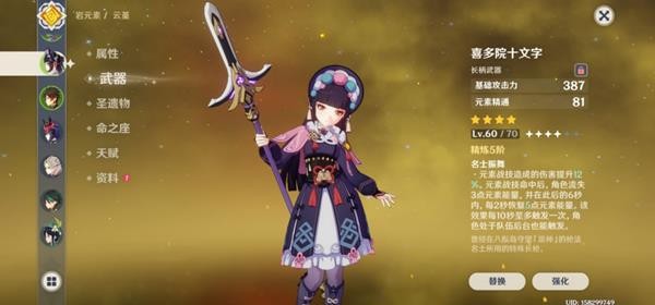 优势:副词条回能稳定,充能压力较小,满精情况下手法正确的话云堇充能仅需180-200就可以保证循环,武器不需要升级,精炼提升很大。