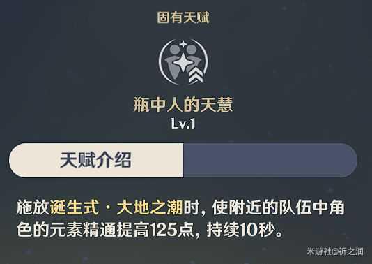 其次如果是打反应的玩家也可以看一看阿贝多的天赋,放一次大招加125元素精通持续10S