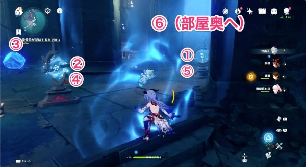 进入机关房后,沿右侧墙壁爬上机关所在的平台,按下图顺序依次启动机关打开大门,进入深处的小房间。注意下图中的①和②可以用于切换昼夜,在转动机关的过程中感觉哪里出了问题可以通过尝试切换昼夜来解决。