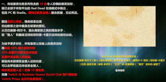 《荒野大镖客OL》中在11月26日进行了一次活动更新,开启了之前所有的10个悬赏目标,各种物品也有一定的折扣,下面为大家带来玩家“逛街的小蜗”分享的《荒野大镖客OL》11月26日活动更新内容介绍,希望对大家有用。