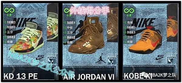 下面这三双鞋可以同时提升三分、抢断和加速(运速),而且另外两个属性也都不算太差,算是目前三分钻鞋的首选了。这其中我认为KD13最好、乔6次之、科比11因为有两项传球属性,所以最后考虑。