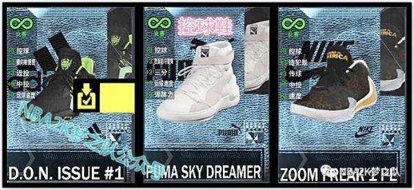 控球鞋的作用其实就是把球员的控球属性拉到86以上,在游戏中后期基本就没用了,前期还是不错的。其中中间那双彪马很不错,可同时提升控球、三分和运速。