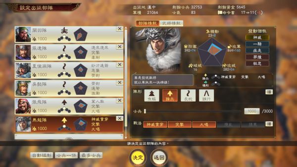 冲车关羽,无疾走的长蛇张辽,有疾走的长蛇小夏侯,有山战的长蛇吴懿,无疾走的锋矢张飞,有疾走的锋矢马超