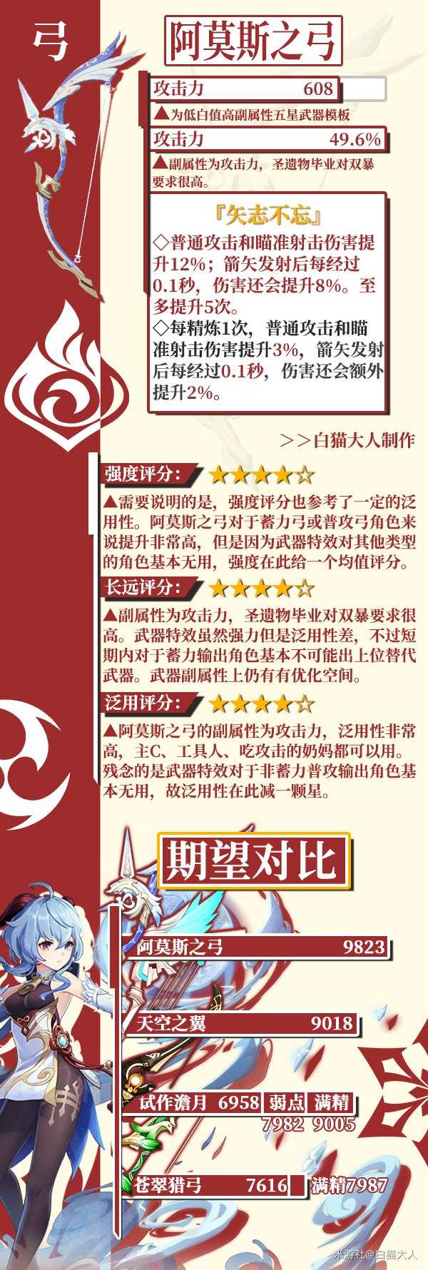 配图中给的阿莫斯之弓的算法是极度偏向蓄力弓的计算,并不是非常客观。在文章最后会补上上次我按定值分配中温迪的数据。阿莫斯之弓的计算是按吃4层武器特效来计算的。值得一提的是,阿莫斯之弓精炼收益很高,满精炼阿莫斯在蓄力弓角色手中能冠压群雄。