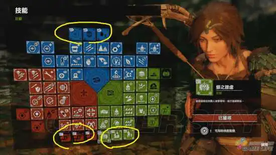 除了装备之外,本作以老鹰、巨蟒、猎豹(技能颜色以蓝、绿、红区分)三种动物特性来区分的技能树还会各追加三种技能,实际位置如下图黄线圈起来的部分。