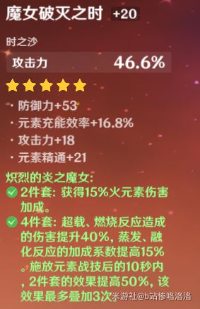 魔女四件套可以提升37.5%火伤、40%超载燃烧伤害以及15%融化蒸发加成系数,当之无愧的毕业套,注意杯子带火伤、头部带爆伤,由于我太非,所以没有火伤杯和五星爆伤头,暂做过度。(下图为参考,以自身实际情况调整)