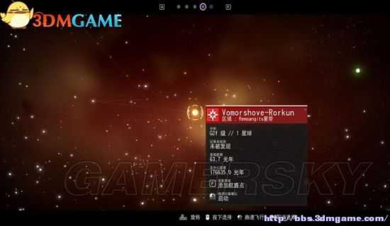 当你打开一幅星图时,星图上显示着你当前所在星系,你沿着航线推动右摇杆,切换到下一个星系上去,再点确认键(手柄A)开始旅行。