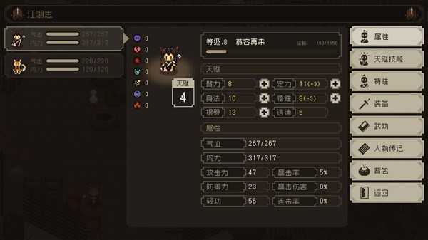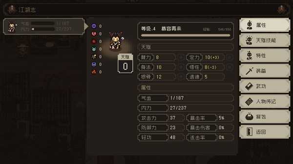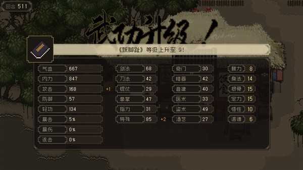又500多回合踩满了,如果有人想练的花,鼠标点一次不动,按1然后鼠标左键,2s一回合。然后因为这里踩脚指满了,所以后续路线规划就不一样了。做菜配合踩脚指应该可以打过江南武林大会。我暂时规划先去大闹神农帮,道德回到5,然后留一颗悟性丹药换特性,之前有大佬说一颗丹药也能换,换完做菜练妙手空空。然后去江南拿一些悟性,太湖水道,招募龙王。遇到卡道德和悟性的剧情就暂停做其他的。等属性够了再去,这样就只剩下练功了,完结