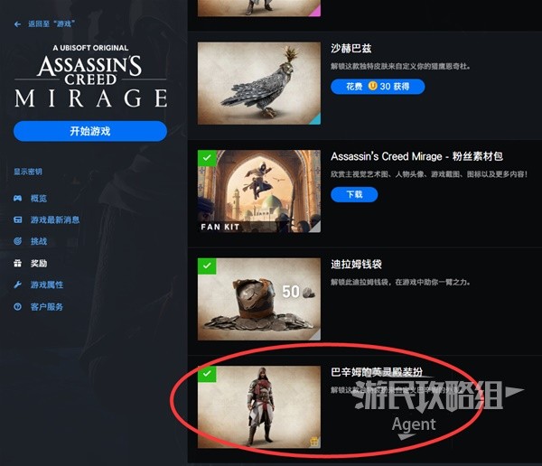 在Ubisoft Connect(原Uplay)启动游戏的界面,下方奖励一栏,使用U点兑换阿泰尔初代服装、艾吉奥启示录服装、巴辛姆英灵殿服装。