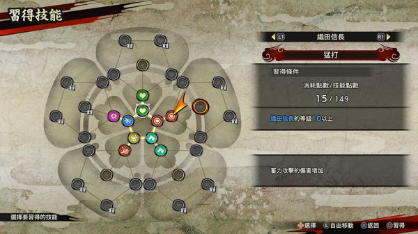 可操控角色各自拥有家纹样式的技能盘,分为提升能力、更容易获得贵重道具等多种技能,玩家可考虑角色应优先学会何种技能。