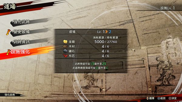 消耗资源或所持金钱可强化各设施。强化设施可提升设施功能,购买更高质量的物品。