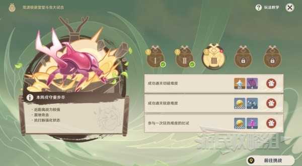 对手情报:硕大沉重的鬼兜虫。可以进入抗打断强化状态。在切磋和锐意难度中,需要通过2次突进或1次「刺挑」破除它的强化状态。而在狂热难度中,仅有「刺挑」可以破除它的强化状态