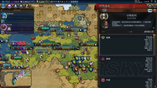 这是神难度波兰游戏中期的一张图,这时候我分数已经领先了,分数主要的来源就在“帝国”这部分,这个分数经过多盘游戏发现主要与人口、区域、城市的数量有关,所以这个战役一定要爆铺密铺,一方面是为胜利服务,另一方面城多就可以当成箭塔打蛮子了。