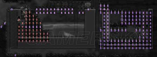 但是这里同时存在一个问题:就是想开发左边的冰原很难绕开左边的这片水域(走卧室上面过要挖很久且要多造很多梯子会很浪费时间)如果走基地下方则和开发下方冰原的路程没上面区别(甚至要更远),所以为了更好地开发左边冰原和基地建设(这片水域也占了很多可以规划的地方),这里临时决定在下方先弄一个大一点的水库,把上方的水快速的引流过去让出道路。