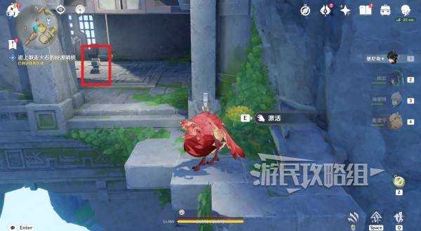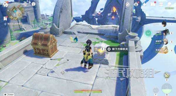 飞到对面顺便拾取神瞳,进入塔内,启动升降梯。