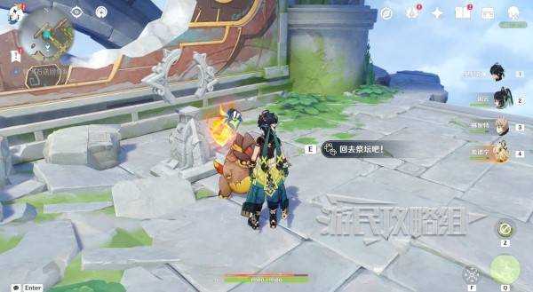 到达浮岛后,等待小龙取走火石。注意这里与小龙互动选择回去祭坛吧,会触发战斗。记得提前调整好战斗阵容。