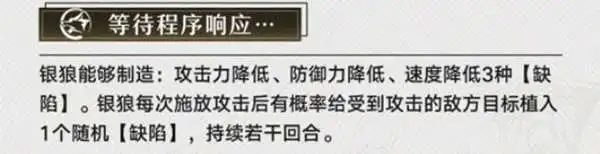 天赋:银狼的天赋就很虚无,她的每次攻击可以额外影响敌方攻击、防御、速度的乘区,持续三回合,效果可叠加。