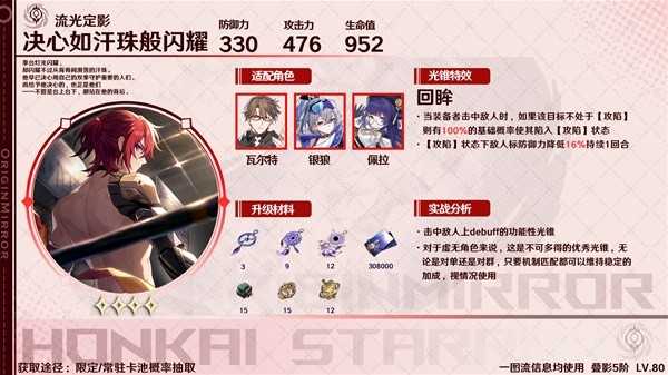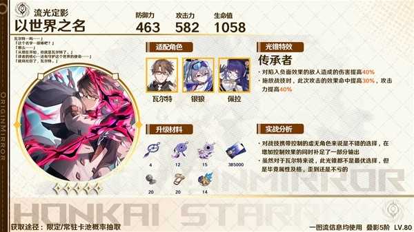 除专武之外,瓦尔特专武【以世界之名】也有效果命中不太够的问题,相对来说还是更适合2魂后的银狼来作为除专武外最好的选择,当然对于0命银狼来讲,不如活动送的光锥好用。