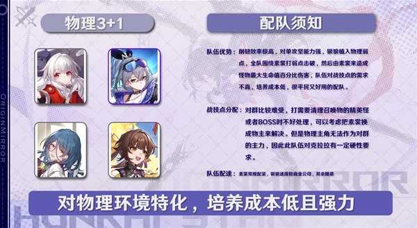 而在低成本的平民队中,有素裳+物理主角+娜塔莎+银狼的三物理队,主要成立的逻辑是,素裳和物理主角的单人削韧能力都很强,并且双c公用弱点植入,由于物理的弱破是按敌人最大生命百分比造成伤害,因此这个队伍的造价也非常低,。