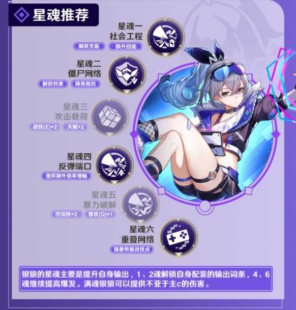 由于独一无二的植入弱点的能力,银狼拥有了整个游戏几乎最高的泛用性,在各种纯色队,尤其是纯量子队中,拥有极高的不可替代性。除此之外,银狼还能提供较为可观的对单伤害,尤其是高星魂后,并且银狼对于战技点的需求并不高,充能需求也适中,是一个抽到怎么都不会亏的优秀战术型角色。
