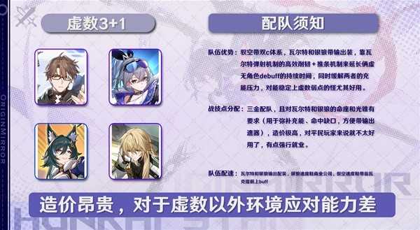 优点:驭空带双c体系,瓦尔特和银狼带输出装,靠瓦尔特弹射机制的高效削韧+推条机制来延长俩虚无角色debuff的持续时间,同时缓解两者的充能压力,对能稳定上虚数弱点的怪尤其好用。