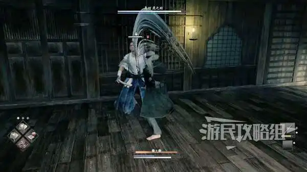 在我们将他的血量削减至一半以下后会突然冲出来一个魁梧武士将俩人拖到外面。