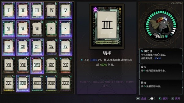 如果是白板杖的话,其实应该是用不到猎手的。悟性不高就先尽量多开提高百分比伤害和生存类的牌,骰子一定是要带的。因为用的是杖3所以还是带了猎手,出门白字可以达到60,法阵增伤打一些敌人的时候如果没有投射法阵之类的祝福我感觉有点不好用。然后女术士也完全可以不开,因为我们这套轮椅基本只点右键就可以了,基本用不上任何蓄力有关的东西。