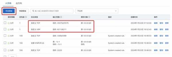 默认创建的云服务器没有开放《幻兽帕鲁》所需的 8211 端口,因此购买好云服务器 ECS 后,你还需要在控制台中配置安全组规则来允许访问 8211 端口: