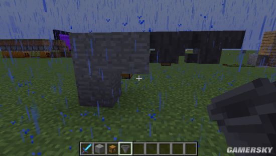 2、如何来实现上图呢,其实很简单,没错,前面提到的石头就是关键了。我们现在地上拜一个石头,然后在石头上安放漏斗,至于是在侧面还是侧面,就看玩家自己的需要了。