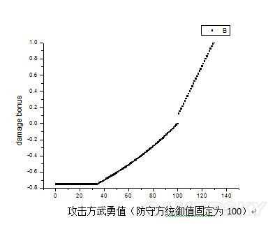 3. 攻击方武勇小于或者等于防御方统御时(武≤统),攻击方伤害量取决于攻方武勇与守方统御的比值,以及双方总兵力和。