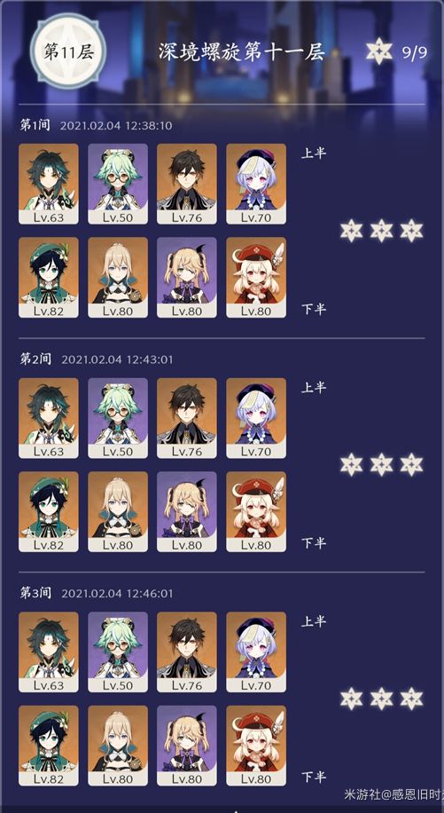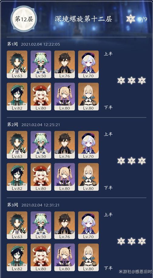 版本更新后,我是直接用这一套,从9-12层,阵容没有任何更换,一次性满星。当时魈只有63级,之后我又打了几次,米游社的数据刷新了,不过阵容一点不带变的,想要了解的点开我主页看就好,没有设置隐藏。