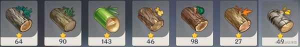 杉木、垂香木、竹节、却砂木、松木、萃华木、桦木 (游戏中道具展示 从左到右)