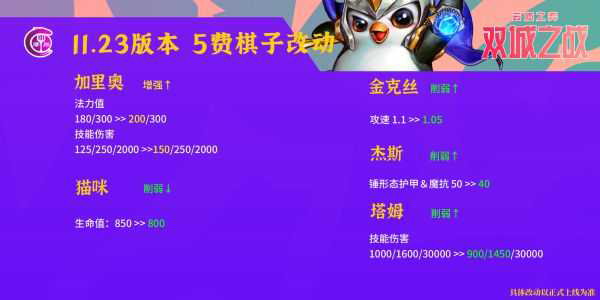 《云顶之弈》双城之战的第二版本对赛季初期的过强过弱棋子进行了改动,不少玩家想要了解本次更新的相关内容,下面请看“摩昂解说”带来的《云顶之弈》11.23版本改动解析,希望能够帮助大家。