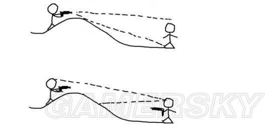 上图便是常见的反斜坡,左边玩家能够看见右边玩家的全身,而右边玩家则只能看见左边玩家的脑袋,更大的面积意味着你的子弹能更容易击中对手。