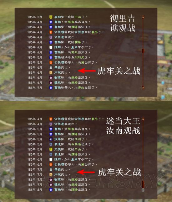 纯粹看剧情,184年黄巾之乱初级难度,选第1个武将 于禁 开局看完桃园结义后,换成 彻里吉 跑到谯观战,结果刚到186年7月就触发了8个事件——