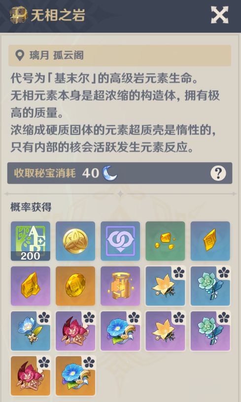 突破材料玄岩之塔按照40体力掉落2-3个(那么需要的击杀无相岩的次数就在16-23次,花费的体力值是640-920点)