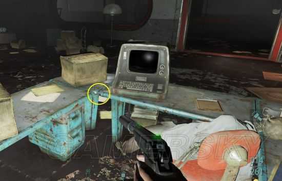 位置在一个红色大厅右侧的房间的终端机下桌子上,藏在一个弹药箱旁边(正路有辐射)。