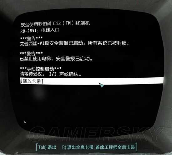 6.集齐三个卡带之后,玩家要一路折回到出口,在电梯终端机上分别插入卡带播放,会提示3次声纹确认。