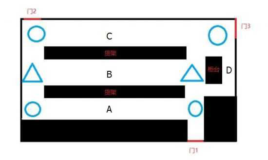 为了方便叙述,超市前门为1号门,后门为2号门(主线有保安门口坐着的那个),仓库门为3号门。 两排货架和柜台隔出的四个狭窄空间分别称为空间A、空间B、空间C、空间D。
