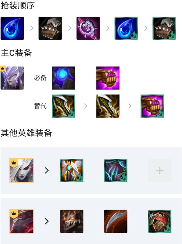 阵容主C是丽桑卓,冰女羁绊主要是魔女和复苏者羁绊,魔女羁绊能够提供回蓝和法术加强,而复苏者能够保证魔女有持续的续航能力,因此冰女不需要做出任何的恢复装。