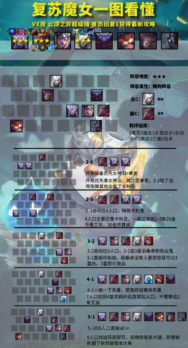 5人口赌出3星冰女就可以拉人口了,如果在选秀或者白嫖到艾翁那么就是天胡了。中期4复苏者羁绊对于冰女来说是质的提升,直接提高了冰女的输出频率以及坦度。