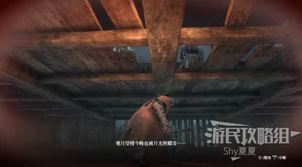 获取信息后,从地板的另一个出口,沿着草丛离开。走到下图位置,也可以偷听情报。得知观月望楼有一个洞可以进入,而洞口在悬崖边。