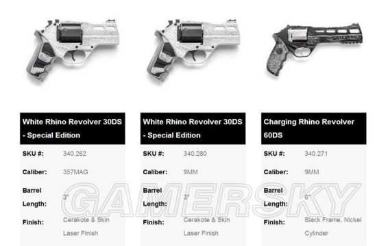 齐亚帕“犀牛”转轮手枪最初仅能发射.357马格南转轮手枪弹或.38特种手枪弹。这两种枪弹都是经典的转轮手枪弹。后来又推出了发射9毫米帕拉贝鲁姆手枪弹和.40自动手枪弹的型号。而《绝地求生》中的.45口径型号在现实中并不存在。在其官方网站上,客户有上百种不同选择,可以根据自己的喜好选购一支“犀牛”。从武器口径,枪管长度、枪身颜色、握把材料,甚至表面花纹,全都可以按照喜好定制。当然,这样的一支手枪价格也相当昂贵。即使是最基础的“犀牛”20DS型,售价也高达1300美元。而定制型的价格就要根据客户的选择来决定了。当然,相比于动辄几千上万美元的其他定制转轮手枪,齐亚帕“犀牛”的价位还是相当亲民的。