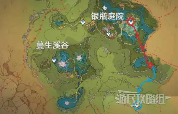 参考上图,传送到银瓶庭院右侧传送锚点。从传送锚点所在位置转向地图东南边。