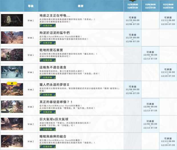 《怪物猎人世界》冰原DLC的任务一直在不断更新,现在到了12月份,冰原DLC的进阶任务有哪些呢?下面就为大家带来《怪物猎人世界》冰原DLC11.29-12.20活动任务表,一起来看看吧。