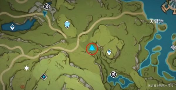 7、来到图中标记处,用风系角色吹散五个沙堆,会出现一普通宝箱