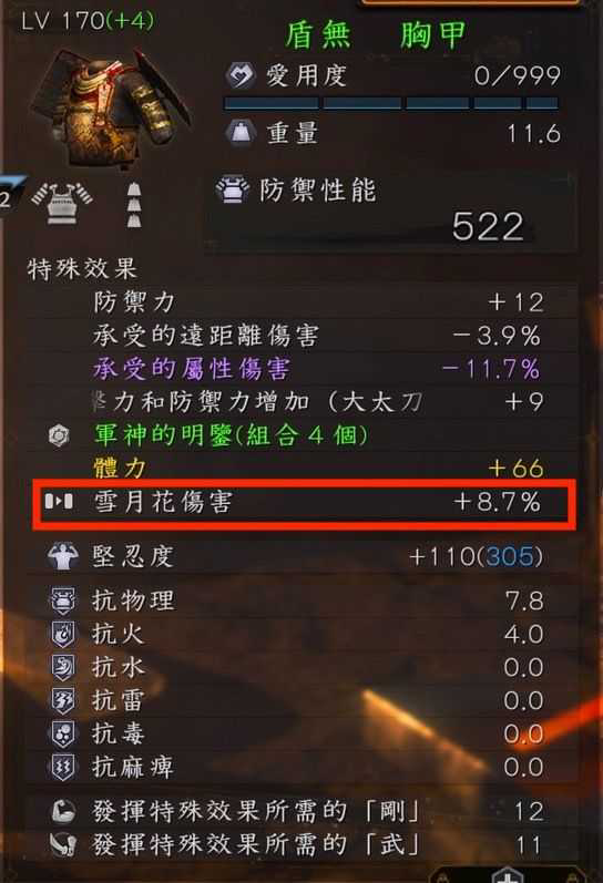 就大太刀雪月花来说,一个继承词条加成8.7%(初始值),防具爱用度满时(绿装为999)可以达到9.7%,这样凑齐五个雪月花继承词条的手臂部件防具,把他们通过合魂继承到其他的防具部件,制作完成之后五件防具都穿上,可以达到接近50%的雪月花伤害加成,是相当可观的输出(一代不卡bug的情况下,也才20%左右的雪月花加成呢!而且还得通过无尽的在铁匠铺SL锻造,才能出一把看得过去的能用的星号武器)。所以是不是明白了?心动了?想刷了?不过你还得继续往下看!