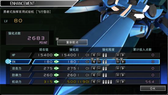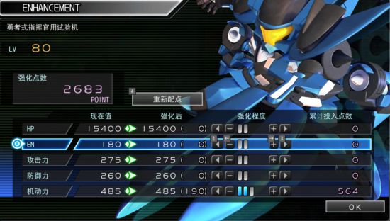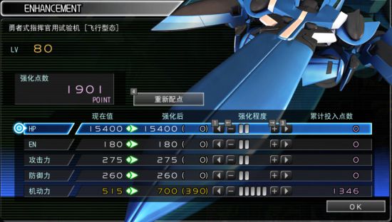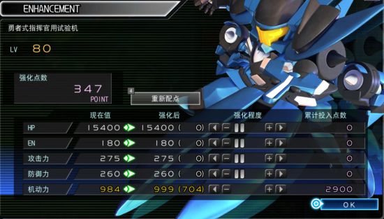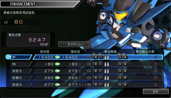 首先,以一只80级勇者试指挥官机做为测试对象,80级3247点强化点数,MS基础机动值295。