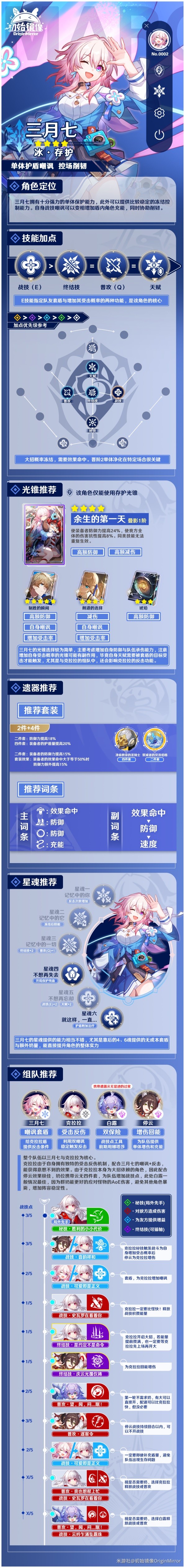 角色一图流内容包括:角色定位、技能加点优先级、光锥推荐、遗器推荐、星魂推荐和组队推荐,认真看完一图流,大家就可以对三月七小姐的玩法有一个大致的思路啦。