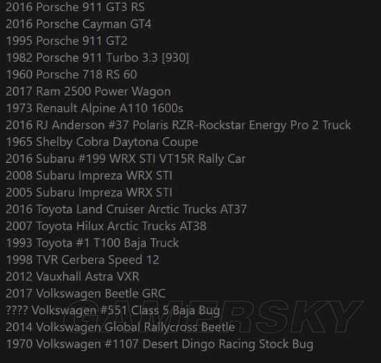 5.已知的系列全新加入车辆:Austin FX4 Taxi(黑出租);大众Beetle GRC;2015 #551 Class 5 Baja Bug;Morris Minor Series II;2018 迈凯伦Senna;1955 Morris Minor Series II; 1970 Land Rover Range Rover;